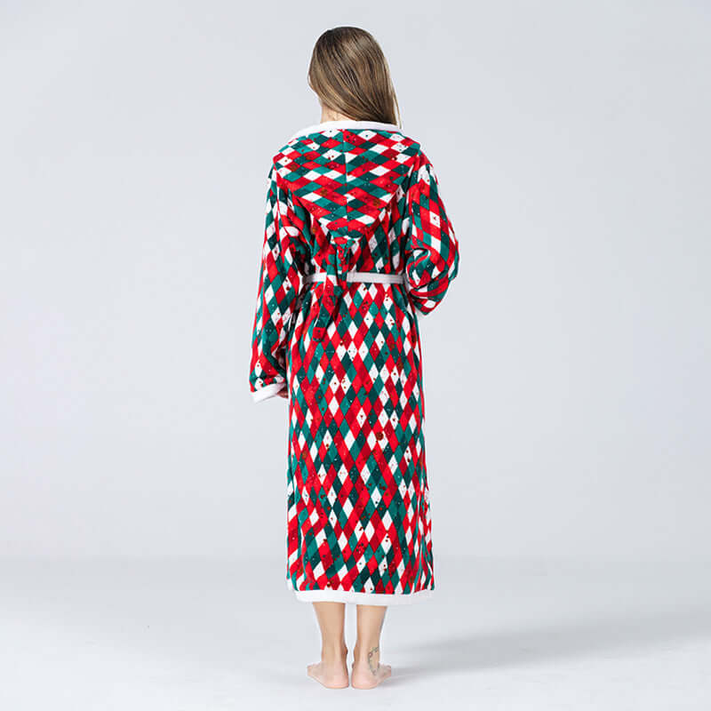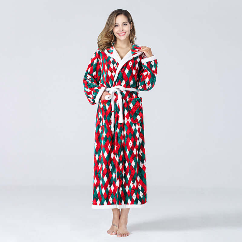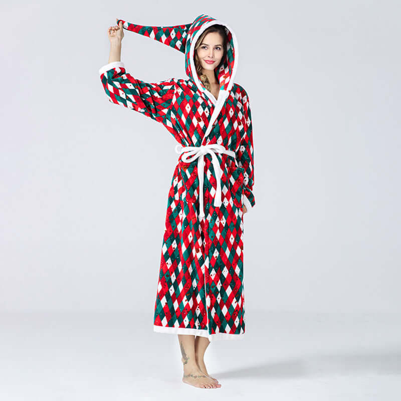Designed for autumn and winter comfort, this long hooded robe features a relaxed fit that allows easy movement and all-day comfort. The soft fleece texture feels gentle against the skin, making it ideal for lounging, morning routines, or winding down in the evening. Its festive Christmas checkered pattern adds a seasonal touch that makes it perfect for holiday nights and cozy moments.