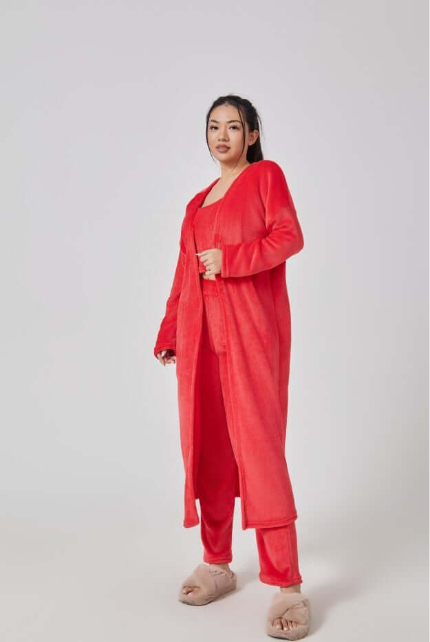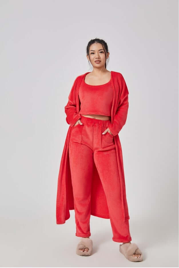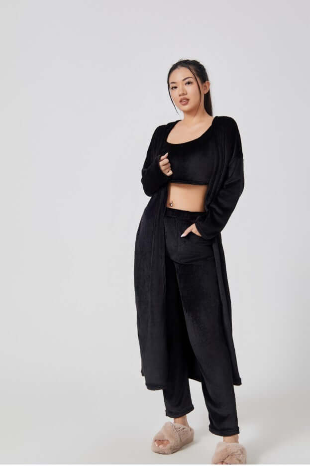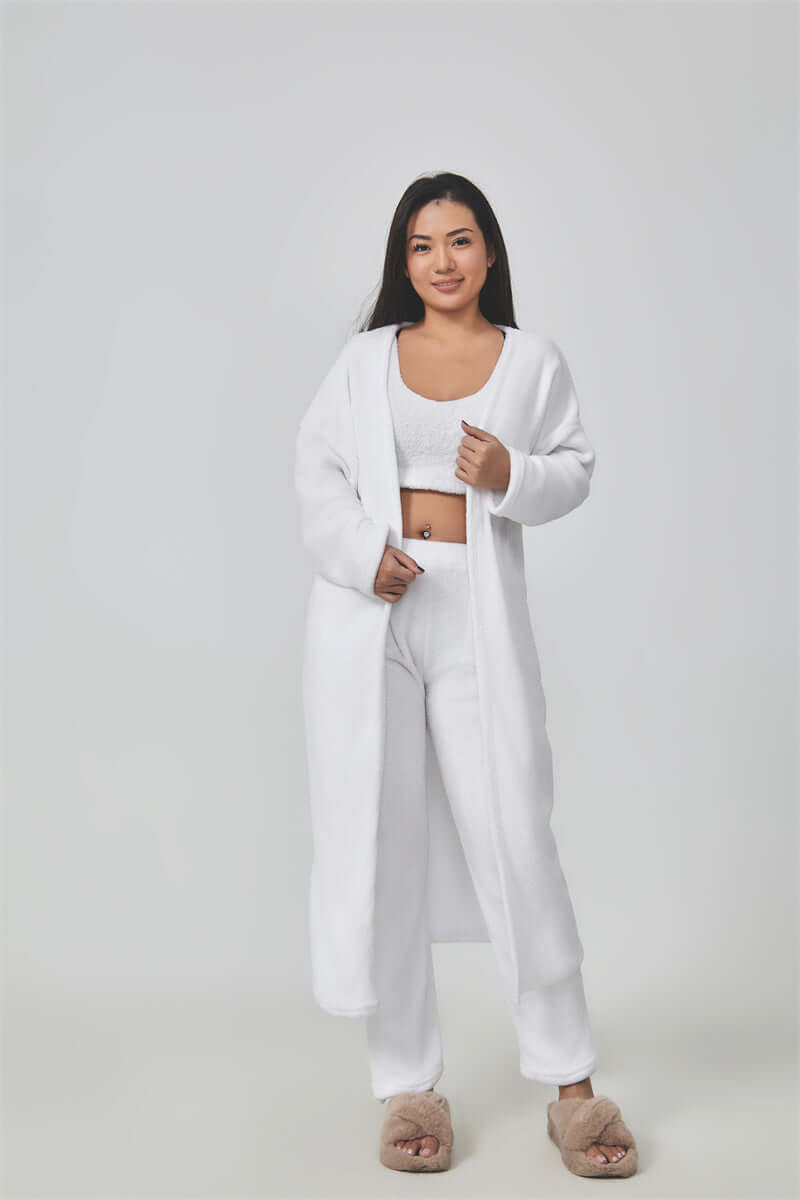 Entspannen Sie sich in luxuriösem Komfort und bereichern Sie Ihre Loungewear-Kollektion mit diesem ultraweichen und flauschigen 3-teiligen Loungewear-Set – perfekt für gemütliche Tage zu Hause oder stilvolle Freizeitaktivitäten. Das traumhafte Set besteht aus einem Crop-Top , einer weit geschnittenen Hose und einem passenden langen Cardigan und bietet die ideale Kombination aus Komfort und schickem Stil.