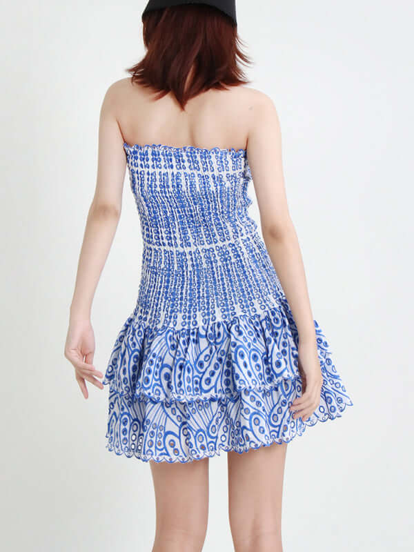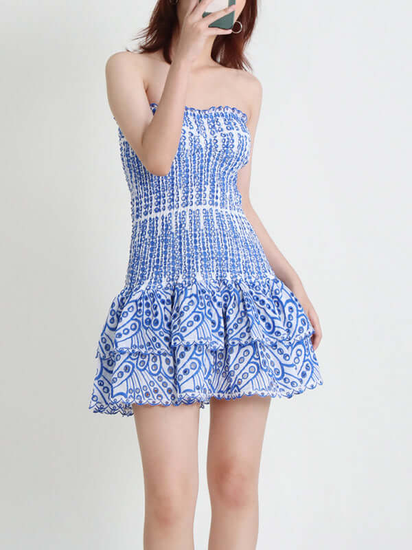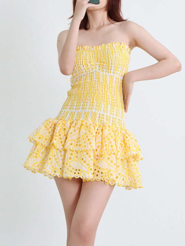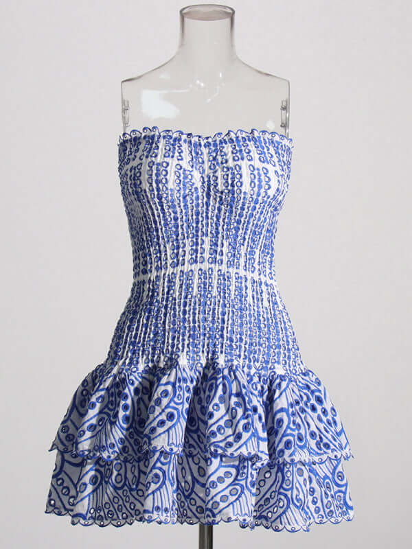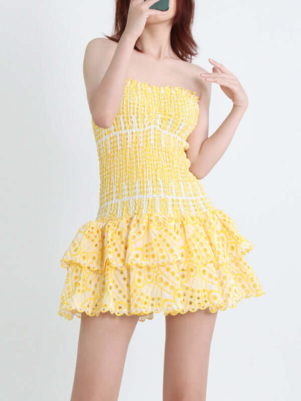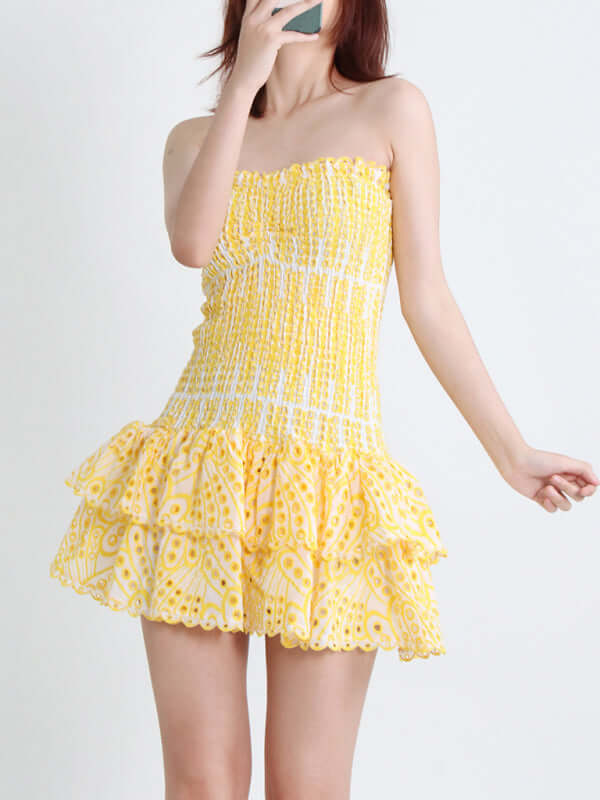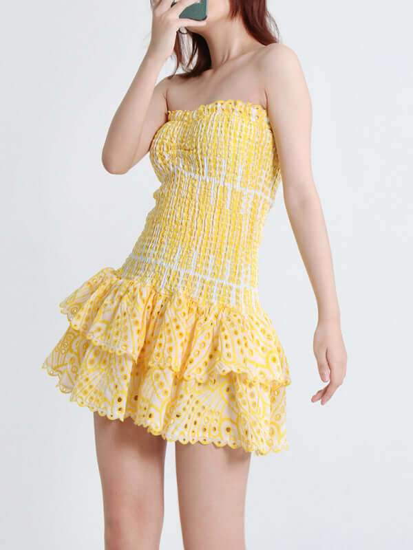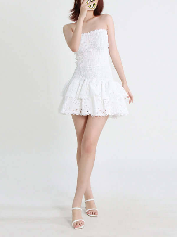 Das elegante, trägerlose, kurze Kleid mit besticktem Rüschensaum ist ein romantisches und feminines Kleidungsstück, das Ihre natürliche Schönheit mit einer schlanken, schmeichelhaften Silhouette unterstreicht. Die exquisite Stickerei und der stilvolle Rüschensaum verleihen diesem Kleid Eleganz und modernen Frühlings-/Sommercharme. Das trägerlose Design sorgt für einen klaren, raffinierten Look und macht es perfekt für Partys, Ausflüge, Urlaube, Dates oder jeden anderen Anlass, bei dem Sie selbstbewusst auftreten möchten.