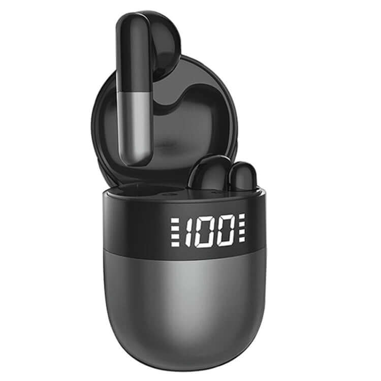 Die kabellosen Bluetooth-Kopfhörer J28 TWS mit LED-Display zeichnen sich durch ein schlankes Design aus, das sich angenehm im Ohr anfühlt. Dank ihres geringen Gewichts sind lange Hörsessions problemlos möglich, und das LED-Display am Ladecase liefert nützliche Informationen zum Akkustand.