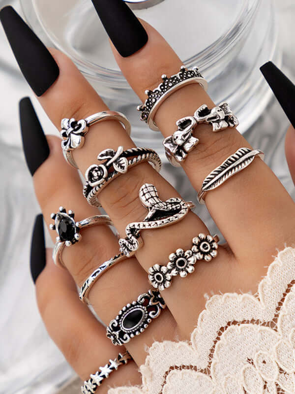 Das Vintage Lotus Sonnenblumen-Ring-Set mit 15 geometrischen Ringen und schwarzen Steinen vereint auf einzigartige Weise Boho-Charme und kunstvolle Details und... Lesen Sie mehr