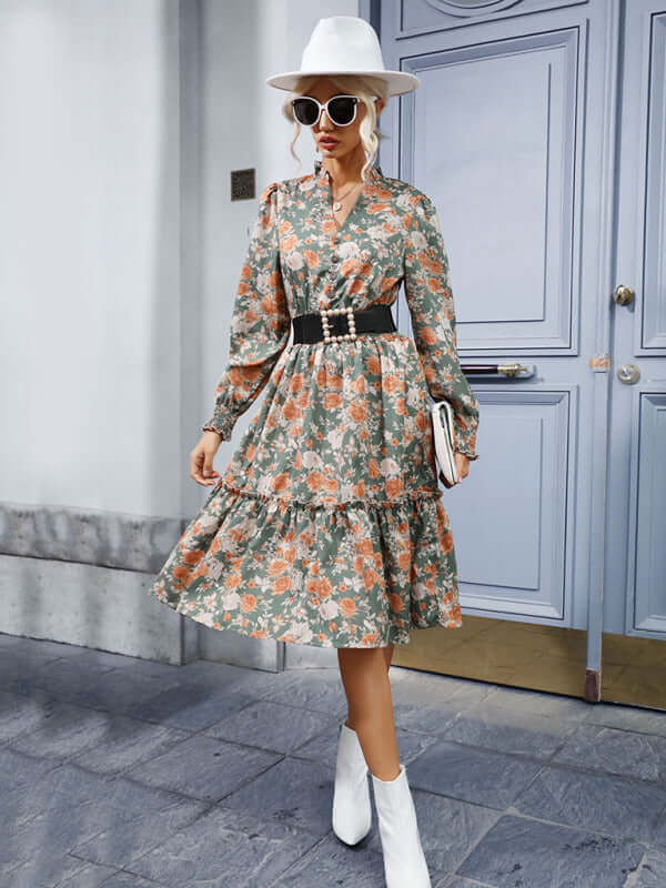 Women Ruffle Print Retro Long Sleeved Dress X Type