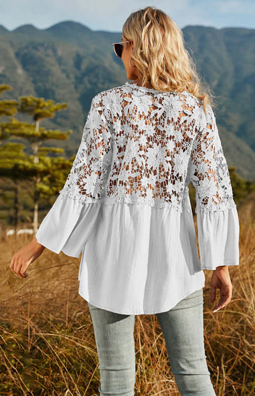 Mit ihrem raffinierten Ausschnitt, den Spitzenapplikationen und dem bequemen Schnitt wird die elegante, stilvolle Damenbluse mit tiefem V-Ausschnitt und Häkelspitze zu einem zeitlosen Kleidungsstück, das mühelose Eleganz für jede Jahreszeit bietet.