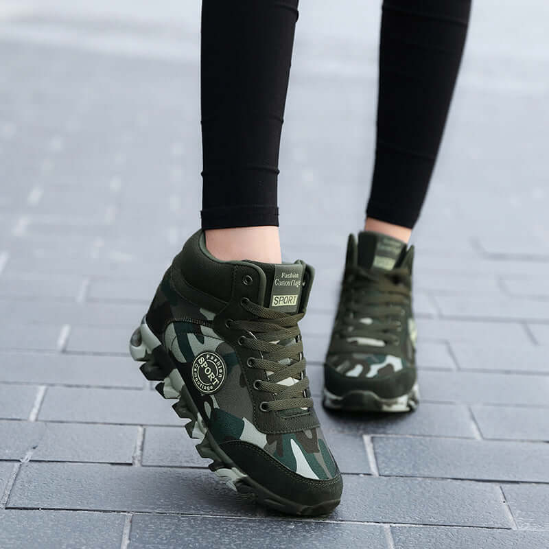 Die Damen-Sneaker mit Camouflage-Muster und Absatz sind ideal für Frauen, die einen stylischen und gleichzeitig bequemen Alltagsschuh im modernen Camouflage-Look suchen. Gefertigt aus strapazierfähigem Canvas und mit einer robusten Gummisohle, bieten diese Sneaker zuverlässigen Halt und sorgen für angenehmen Tragekomfort – egal ob beim Spazierengehen, Einkaufen oder bei entspannten Outdoor-Aktivitäten. Dank des dezenten Absatzes wirken die Damen-Sneaker mit Camouflage-Muster etwas größer, ohne dabei auf Komfort zu verzichten. Damit sind sie die perfekte Wahl für modebewusste Frauen, die Wert auf Funktionalität und Ästhetik legen.