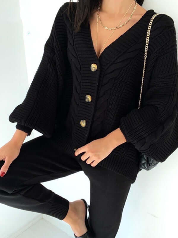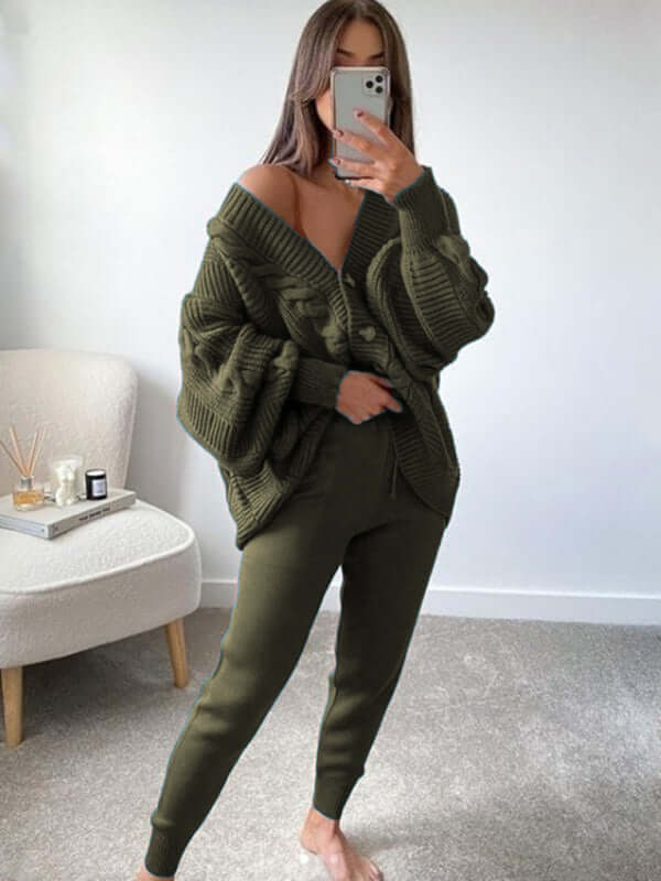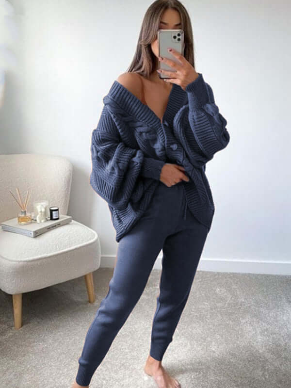 Ob Sie es bequem mögen oder einen schicken Freizeitlook bevorzugen – der Damen-Strickanzug mit V-Ausschnitt und kuscheliger Strickhose bietet Vielseitigkeit und Wärme zu jeder Jahreszeit. Dank seines klassischen Designs und der hochwertigen Verarbeitung ist er eine zeitlose Bereicherung für Ihre Garderobe.