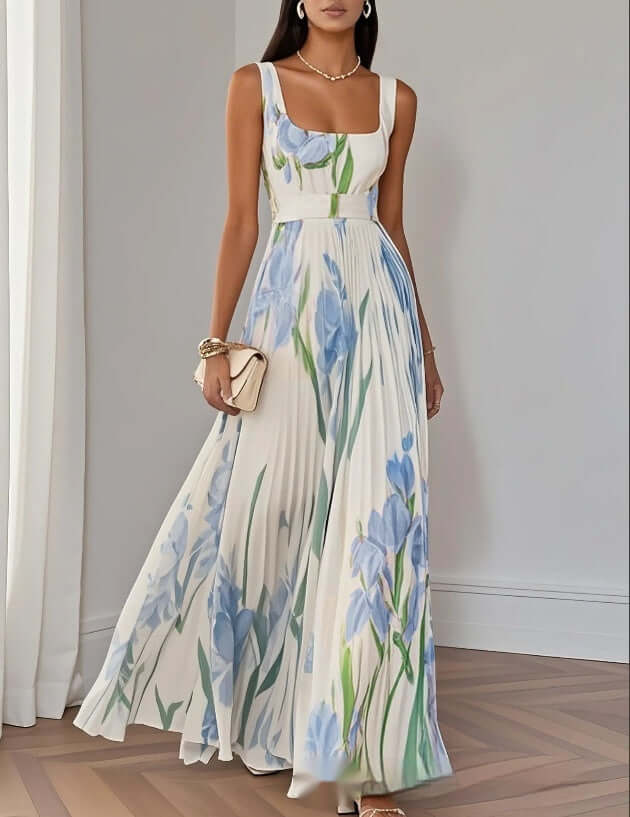 Floral Print Pleated Dress Summer A Line Sleeveless Midi Dress