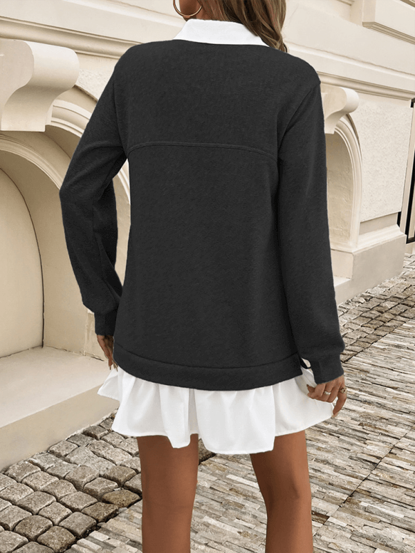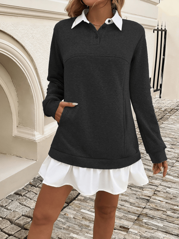 Casual Loose Patchwork Polo Neck Long Sweatshirt Dress X