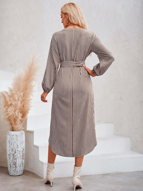 Casual V Neck Striped Tie Waist Shirt Dress Woven