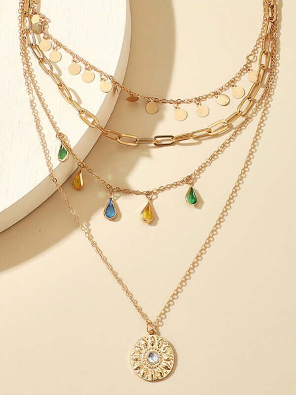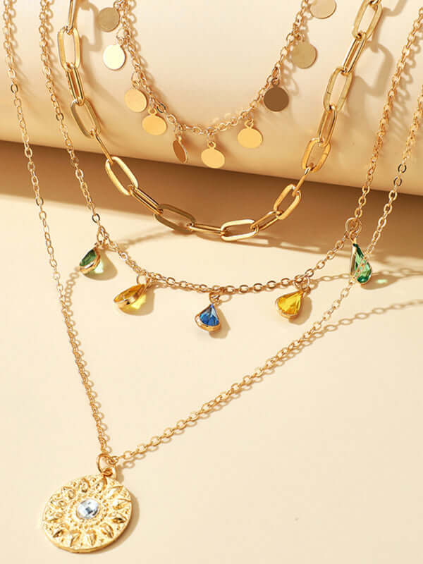 Geometric Disc Tassel Layered Necklace | Rhinestone Pendant