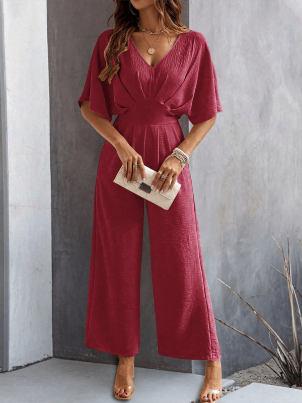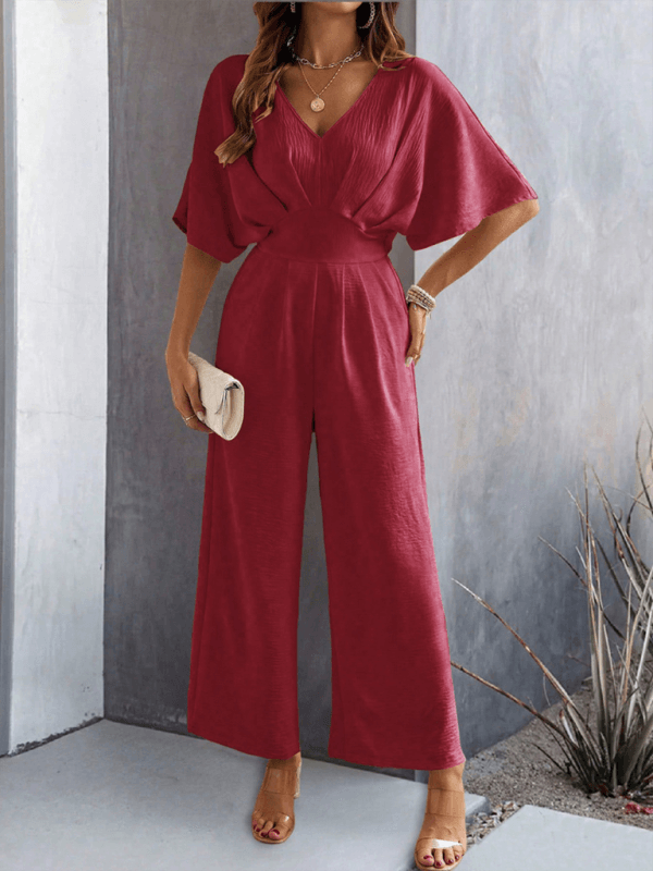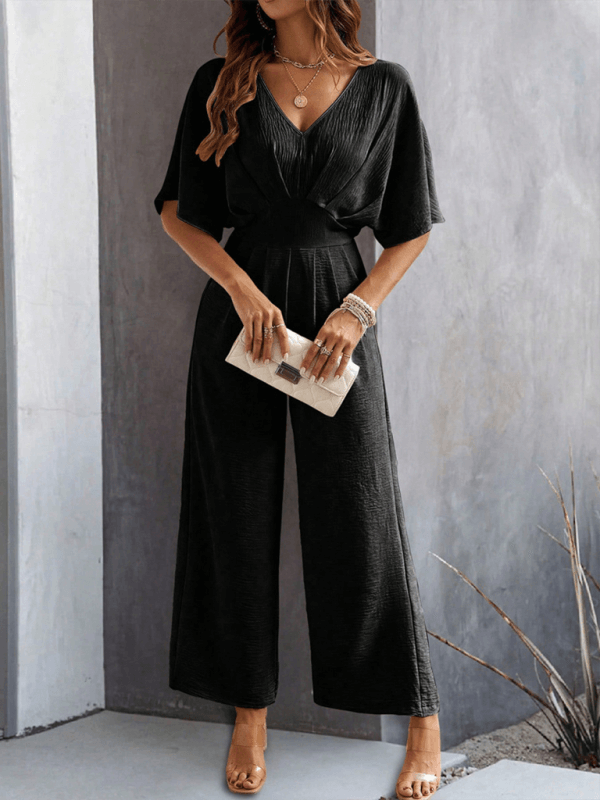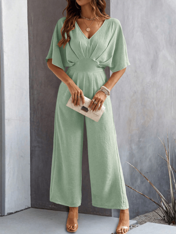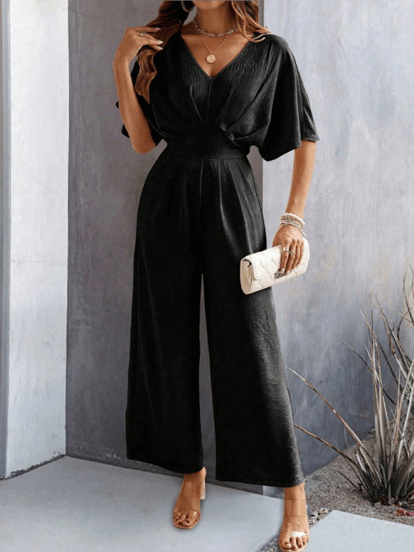 Women Short Sleeved Wide Leg Jumpsuit V Neck Leisure