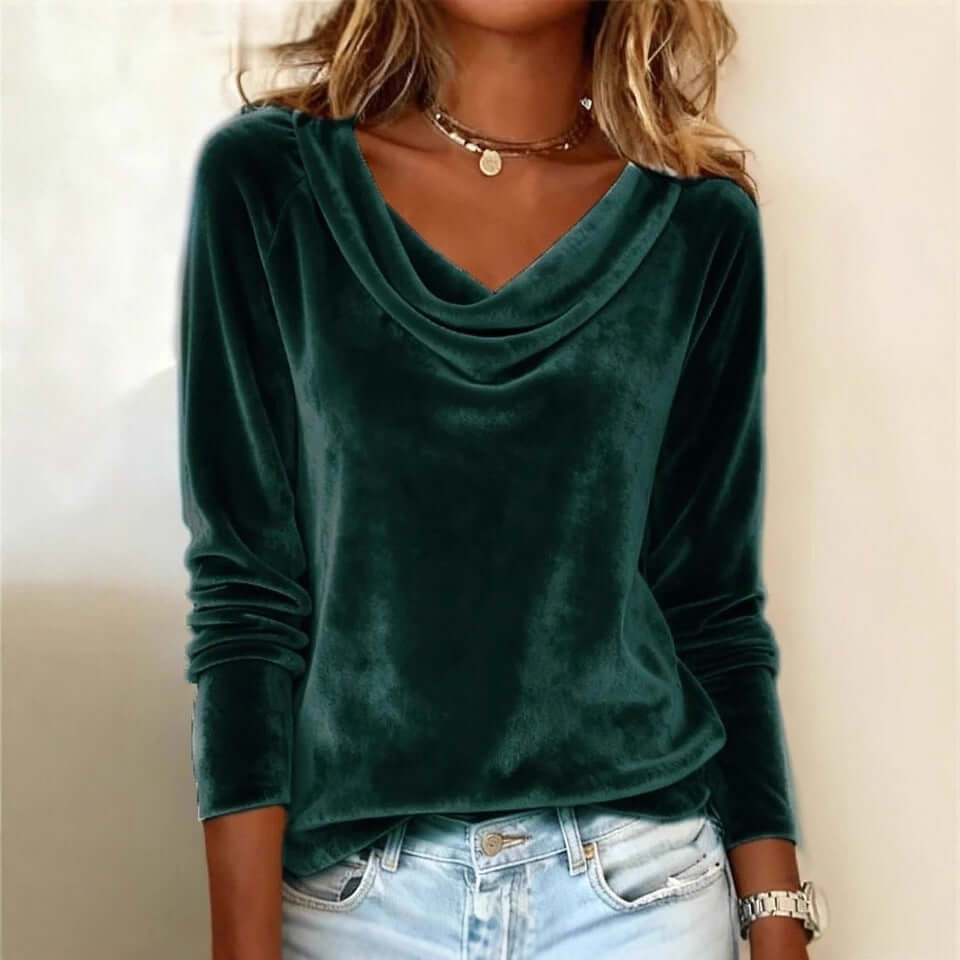 Step into the spotlight with our Womenr Velvet Long Sleeve Shirt, a perfect blend of luxury and comfort for the modern woman. Crafted from high-quality gold velvet fabric, this top offers a soft, shimmering texture that instantly elevates your look. Whether you are attending a party, heading to the office, or enjoying a casual day out, the stylish irregular cowl neck design adds a unique touch of sophistication to your outfit.